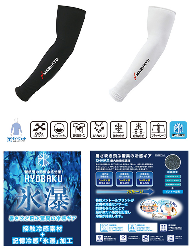 | 暑さ吹き飛ぶ驚異の冷感ギア 接触冷感素材+記憶冷感「氷瀑」加工を施した、腕の日よけ対策に効果的な冷感アームカバーです。特殊メントールプリントが、皮膚の冷感センサーを刺激。脳が冷たい感覚を記憶することで、冷感効果が持続します。着心地にもこだわり、縫製は快適な肌ざわりでストレスを軽減するフラットシーマ仕様に。生地は2WAYストレッチを採用し、あらゆる動きにもスムーズに対応。 |