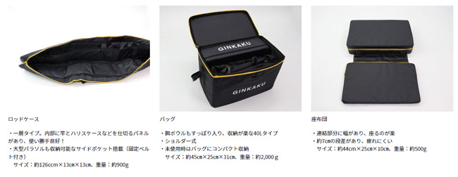 | カラー;ブラック ロッドケースサイズ;約126×13×13cm 重量:約900g バッグサイズ;約45×25×31cm 重量:約2kg ザブトンサイズ;約44×26×10cm 重量:約500g |