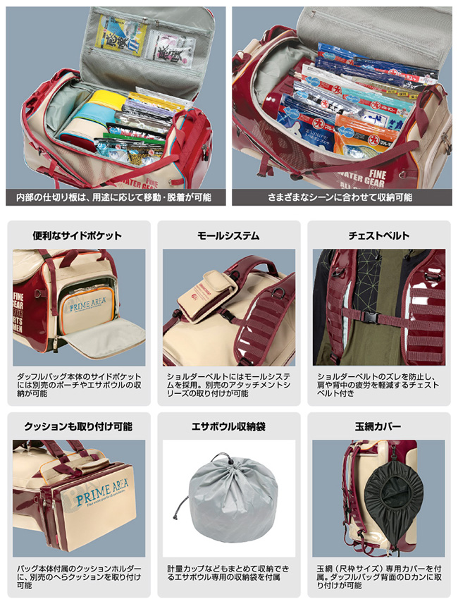 | 大容量で機能的。背負えるダッフルバッグ 大容量(約60L)で必要な道具、エサまで全て収納可能なダッフルバッグです。万力などの小物からエサまで必要なアイテム全てが収納できる大容量で、エサの消費が多い夏場のハイシーズンでも対応可能です。ショルダーベルトにはモールシステムを採用し、別売りの「アタッチメントシリーズ」を装着でき自分好みにカスタマイズできます。チェストベルト付きで、ショルダーベルトのズレを防止し、肩や背中への疲労を軽減します。また、クッションホルダー付きのため、へらクッションの装着も可能です。エサボウル専用の収納袋と玉網(尺枠サイズ)専用のカバーがそれぞれ装備されており、エサボウルは本体外側のポケットに収納、玉網は本体外側にあるD管に接続可能です。内部には仕切り板が2枚装備され、用途に応じて移動や脱着ができ好みに応じた収納様式が可能です。 |