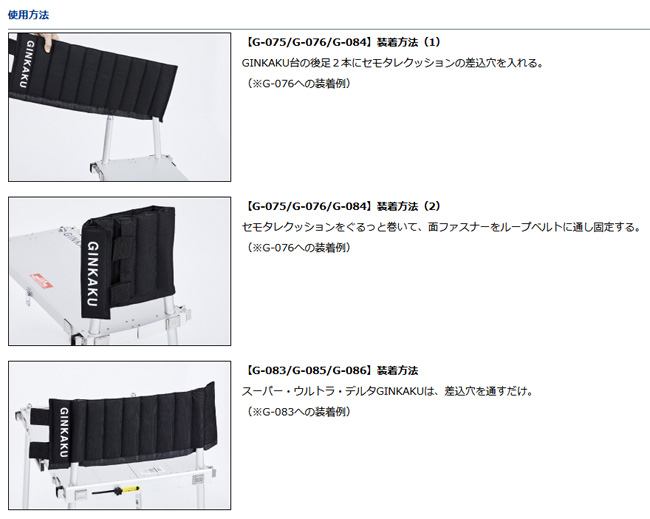 | 簡単便利なセモタレクッション登場! ・へら師の腰の苦痛を和らげるセモタレクッション ・GINKAKU台の後ろの足2本に差込むと背もたれになる ・クッションパッド内蔵 ・足が入れやすい段差入り口 ・10個の差込穴で各GINKAKUに対応 ・コンパクトサイズなので、G-083/G-085の中に収納できる ・予備の足の保管用としても使える |