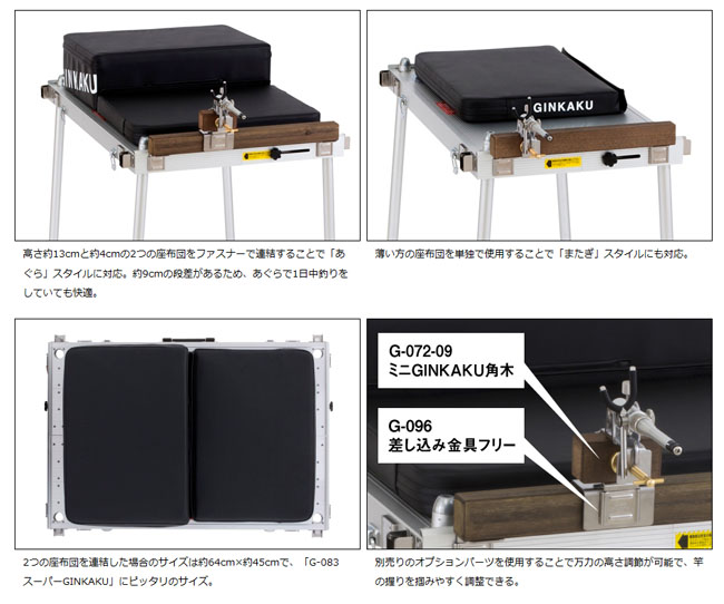 | GINKAKU釣り台に挟んで使用するビッグ座布団。あぐら段差で1日中釣りをしていても楽々! ・高さ約13cmと約4cmの2つの座布団をファスナーで連結することで「あぐら」スタイルに対応。約9cmの段差があるため、あぐらで1日中釣りをしていても快適。 ・薄い方の座布団を単独で使用することで「またぎ」スタイルにも対応。 ・2つの座布団を連結した場合のサイズは約64cm×約45cmで、「G-083 スーパーGINKAKU」にピッタリのサイズ。 ・別売りのオプションパーツを使用することで万力の高さ調節が可能で、竿の握りを掴みやすく調整できる。 |
