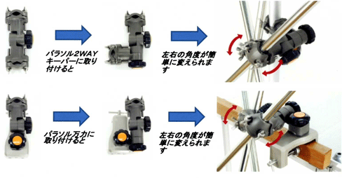パラソル万力(別売)、パラソル2WAYキーパー(別売)、パラソル万力ダイキャスト(別売)に取り付けるだけで簡単に左右の角度が変えられるジョイントです。