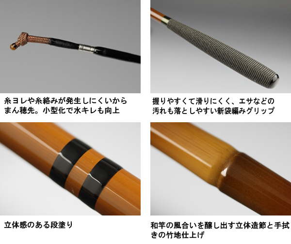 | クラスを超えた機能を搭載した使い勝手の良い硬式先調子へら竿 スムーズな曲がりの支点移動によって高い操作性を実現する『株理論』設計を採用し、へらぶなの引きをしっかりとした胴で受け止め、浅ダナからチョウチン、管理釣り場から野釣りまで、釣り場や釣り方を問わない硬式先調子の本格仕様。 一節一節手作業によって作られるその意匠は高級へら竿の代名詞とも言える「節出し段塗」。飽きることなく末永く使える逸品である。 |