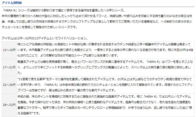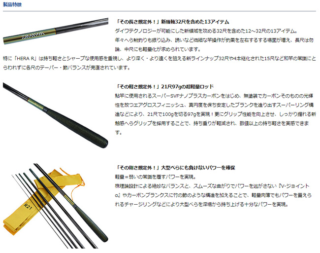 | 「軽さは、攻撃力。」軽量並へらシリーズ「HERA R」が登場。 ダイワが放つ軽量系並継へら竿の最高峰シリーズ 株理論設計をベースにダイワカーボンテクノロジーの粋を集めて開発した12尺〜32尺の中尺〜超長尺までラインナップした軽く・長く・剛い新機軸並継へら竿シリーズ ●株理論設計:和竿の生地組みにヒント得て尺ごとにバランスを取りながらスムーズな振込み、取り込みを実現する設計手法 ●スーパーSVFナノプラス(17〜32尺):SVFよりもよりカーボン繊維の密度をが高く、より軽く強いロッドを可能にするカーボン素材「S-SVF」に東レ(株)ナノアロイテクノロジーダイワ独自の製法で組み合わせ、さらなる高強度化、軽量化を可能とした。 ●V-ジョイントα:ナノプラスを含む高強度素材とダイワ独自の超高精度ロッド設計、製造テクノロジーによって、よりスムーズなパワー伝達により、株理論設計の精度向上、へら鮒を浮かすパワーが向上 ●エアグロスフィニッシュ:カーボンロッドの性能を最大限引き出すダイワ独自の特殊表面処理。軽量化に貢献 ●チャージリング:ブランクスの適所に極薄いカーボンシートを加えることで、竹節のようにしなやかで粘り強いブランクスを可能にする機能 ●スーパーリング構造(17〜32尺):ブランクスの真円度を高めることで、竿ブレ軽減、軽量化など操作性が向上 ●新触感へらグリップ:巻糸による立体感と濡れても滑りにくい塗装を組み合わせることで実現した、ソフトでしっかり握れるグリップ ●へら専用極細からまん穂先。 |