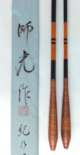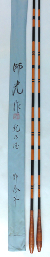 1960年頃シラサエビをエサに小チヌ釣りが大流行でした。紀州へら竿では硬調すぎて細いハリスに対応できないと兵庫明石の阪田釣具店主からの依頼で、初代師光が極軟調子のチヌ専用竿を製作し大ヒットした商品です。中学生だった大阪屋店長も何度も納品に同行し明石港で泳げるのを楽しみにしてた思い出の逸品です。このようなチヌ竿は非常に珍しく家宝になります。12尺と15尺に使用できます。お買い得価格に値下げしました。 Aランク |