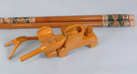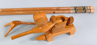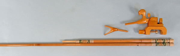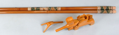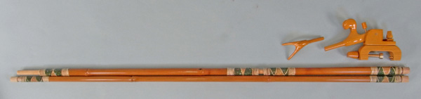 グリーンの塗りにラデンをあしらい、金粉をアクセントにした豪華な仕上がりの竿掛け。2本物の竿掛けもできました。口には籐巻きを施してあります。万力は明るいカラーで、竿掛けにあわせています。使いやすい大砲万力とのお買い得価格のセットです。