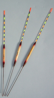 | かや浮子、かや1本取り・ハイテクトップ2.0φ・カーボン足1.2φ。ペレ宙・両ダンゴ・両トロロ等、盛期の特に魚がはしゃぐ時に最適です。太いボディでオモリ負荷が大きく、2.0Φのハイテクトップなので大エサ・重エサをしっかりなじませることができます。特に大きいヘラが中心の釣り場で効果的です。しっかりとなじませることによって最大の効果を発揮します。小エサや小バリ、落ち込みのアタリなどには適しません。力強いアタリを狙って下さい。浅ダナからチョーチンまで、タナを選びません。ウキが立ってからのウケがきつい時にはウキを大きくして下さい。エサ落ち目盛は5〜7目出しを目安にして下さい。 | ||